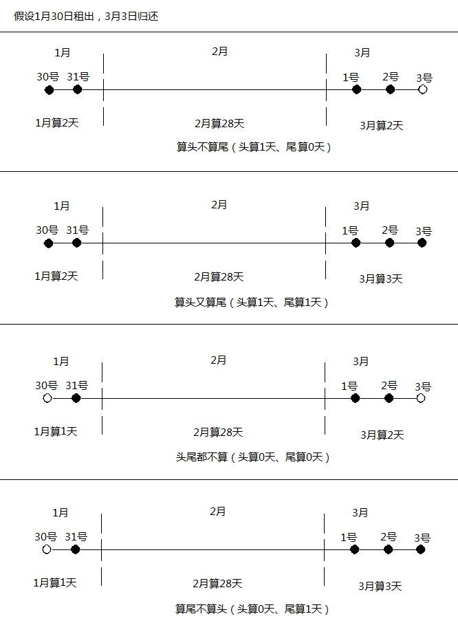 因为4种算法都是针对整个租赁周期算的,只与租赁日和归还日有关系,与中间的日期是没有关系的。